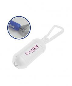 Easily attaches to leash or belt loop with carabiner. Refillable compartment holds 20 disposable bags. Fits most store purchased bag refills. Ideal for pet stores, veterinarians, groomers and dog shows. Complies with Prop 65. 4 1/2" W x 1 3/4" H