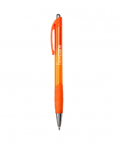 Click style transparent pen with matching rubber grip. Black medium point.
