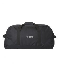 Black polyester 30" duffel bag with adjustable shoulder strap, side grip handles, and front zippered pocket.